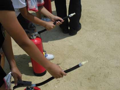 右の写真はけむり体験をしているところです。1メートル先が全く見えず、すぐ前の友だちがなんとか見えるくらいでした。少しこわいなと感じました。