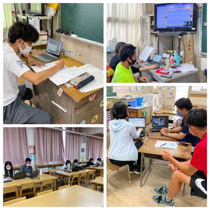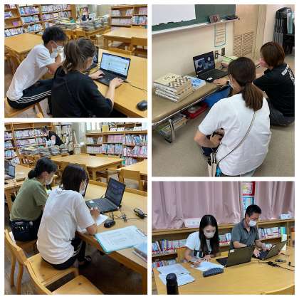 平林小学校と新北島中学校との3校をオンラインでつなぎ、各教科・領域に分かれて情報交換を行いました。