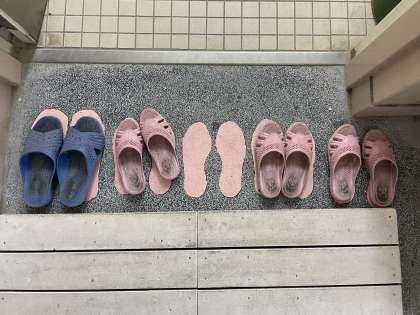 管理作業員さんが、スリッパを並べやすいように足形を描きました。