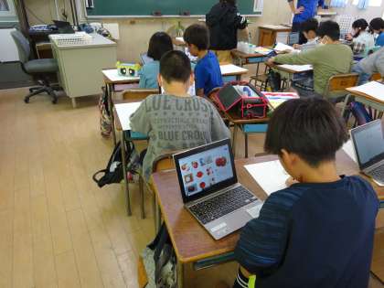 4年生では「リンゴかもしれない」という不思議なイラストを描く前段階として、「画用紙いっぱいに大きく描く」ことをめあてに、タブレットで調べたリンゴを描きました。どんな不思議なリンゴに仕上がるのか楽しみです!