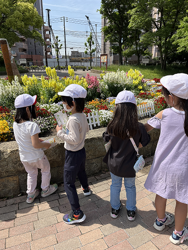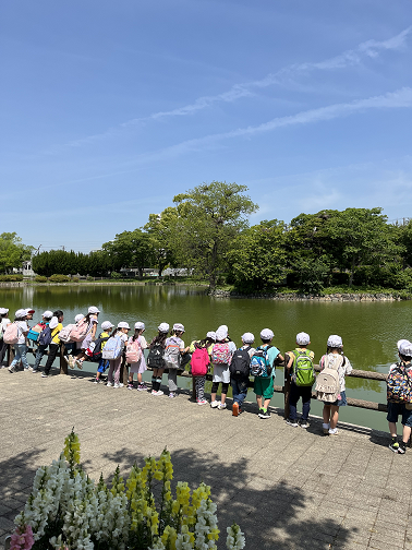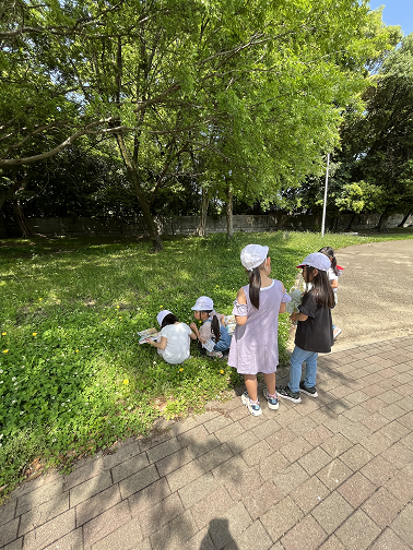 学校から歩いて「住之江公園」へ行きました。とってもがんばって歩けていました! 到着後、図鑑を片手に自然観察をしました。シロツメグサやタンポポを見つけたり、サギの家族を観察したりしました。