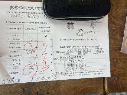普段食べているおやつについて色々考え、どれぐらいの砂糖が入っているのか予想したり、食べる時にはどんな事に気を付けなければいけないか考えたりしました。