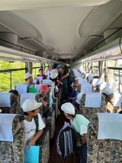 いよいよ林間学校です! 天気は上々。バスに乗り込み。欠席者もなく、元気いっぱい「いってきます!」