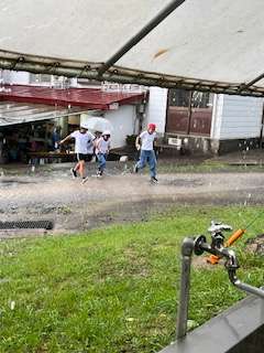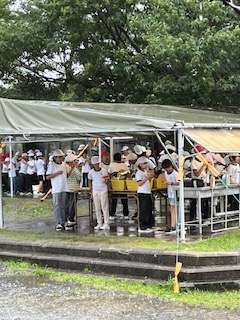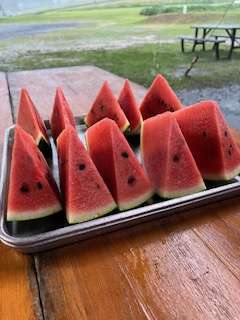 山の天気は変わりやすく、大雨となりました。そんな中、カレー作りで使った食器を返すのも大騒ぎ。キャーって大雨の中走るのも楽しくて。そのあと、宿舎からスイカをいただきました。