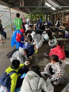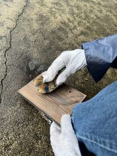 焼いた杉の板をタワシでこすって、さらに古タオルで磨くとツルツルになります。単純作業が楽しいです! 晴れてきました!