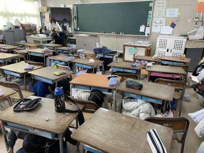 地震が起きたら、机の下にかくれ、地震がおさまったら避難します。