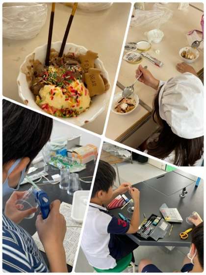 家庭科・手芸クラブでは、パフェづくりを行いました。アイスや生クリームなど、おしゃれにトッピングをして、とてもおいしそうなパフェでした。