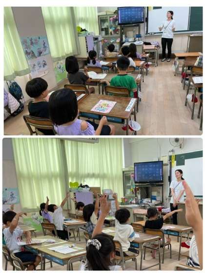 4月に入学した1年生ですが、新しい先生や新しい友だちにも慣れてきて、ぐんぐん成長しています。先生のお話をしっかり聞いて、「はい」と手を挙げて発表します。
