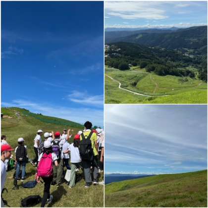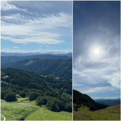 午後最初の活動は山登りです! みんなと一緒だから頑張れる。ゴールでは、きれいな景色とたくさんの赤トンボがお出迎えしてくれました♪ 太陽の周りに虹が出ていました♪