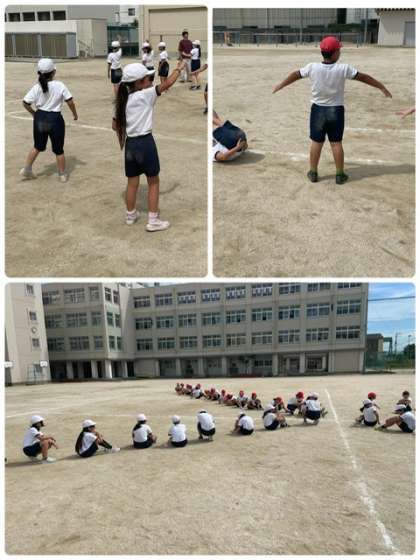 組体操の一人技のような片手バランスや肩倒立の場面もあって、迫力ある演技です。体操服に土がついても堂々と演技を続ける姿がとてもかっこよかったです。隊形移動もたくさんありますが、すばやく移動していて驚きました。