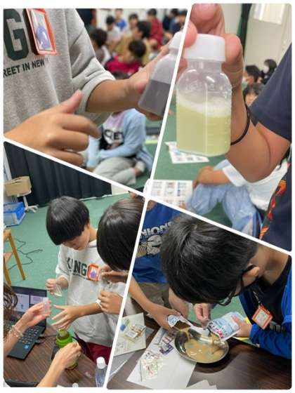 実際に、貧血の薬を水とお茶で溶かす実験しました。すると、お茶で溶かすと、成分が反応しあって薬が真っ黒になってしまいました。みんなとても驚いていました。