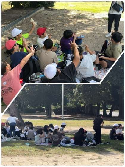 今日も晴天のなか、5年生が「服部緑地公園」に遠足に行きました。朝から「早く行きたい」と楽しみにしながら登校していました。