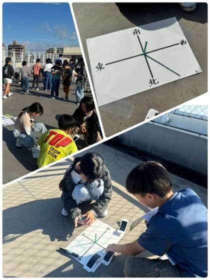 方位磁針や遮光板を使って太陽の向きや影の様子を観察していました。普段は、屋上に上がれないので、とても貴重な経験ですね♪