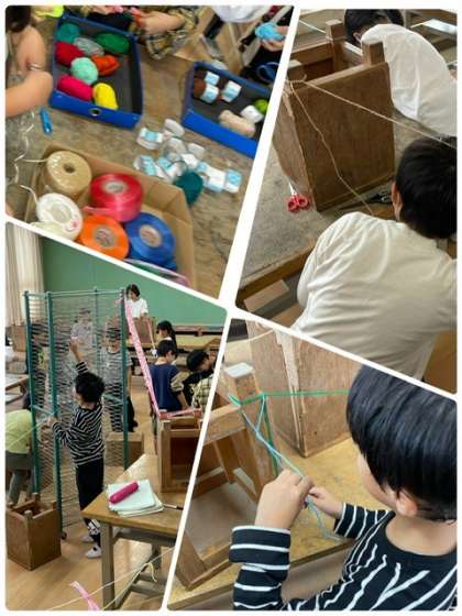 毛糸やビニールひもなど、いろいろな種類のひもを使って、造形あそびをしていました。教室のイスやテーブルなどにひもを結びつけて楽しんでいました。