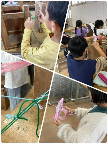 最初はどうしたらいいのか戸惑っている子どもたちも、一つ結ぶと…次はこっち!とどんどん結んでいきます。あっという間に図工室が「ひもひもランド」に変身しました。