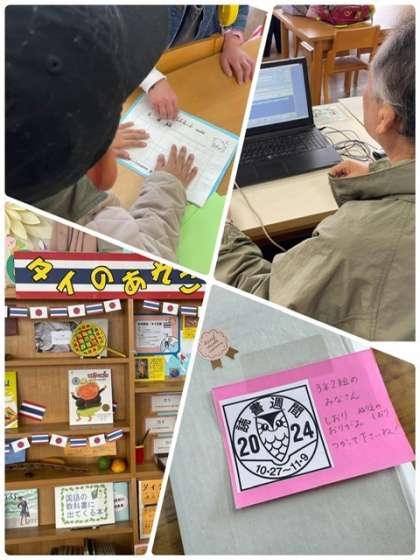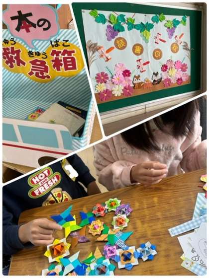 図書は教職員だけでなく、図書館ボランティアさんや司書さんにも支えてもらっています。放課後の図書館開放や、図書室に四季の掲示物など、みんなのために図書室を使いやすくをしていただいています。