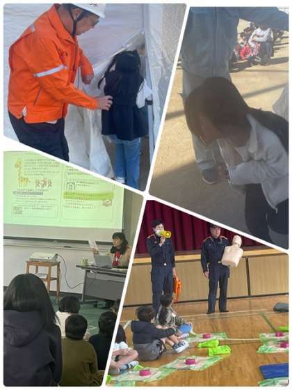 煙ハウスの体験や担架で友だちを運ぶ体験など、いろいろな防災に関する学習をしています。