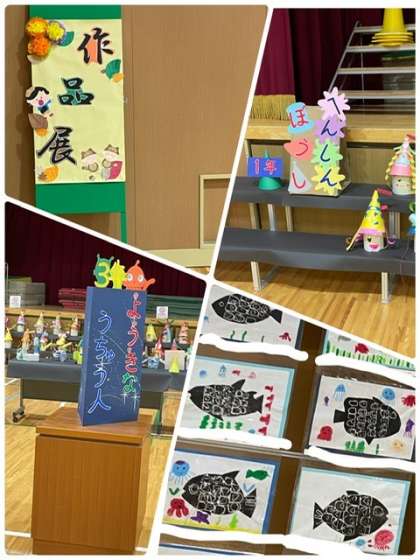 講堂では、「作品展」が行われています。一人ひとりの絵画や立体作品を展示しています。ご覧ください。