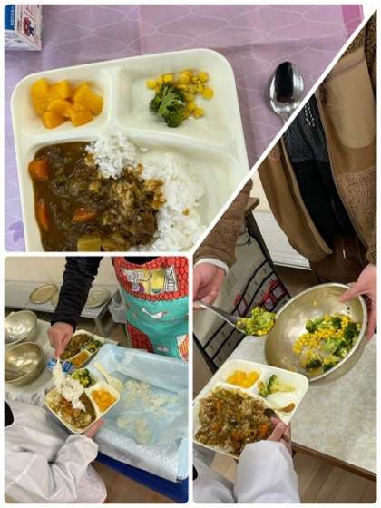 今日の給食は、「冬野菜のカレーライス・ブロッコリーとコーンのサラダ・黄桃」でした。冬野菜のカレーは、だいこんやれんこんがゴロゴロっと入っていて、とてもおいしかったです。そして、今日は「ラッキーにんじん!」の日でした。
