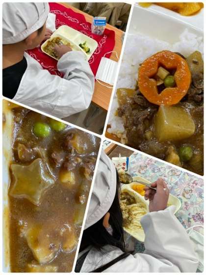 給食調理員さんが、ニンジンやダイコンを星形やハート形などにして調理してくださっています。自分のカレーにはいっていると「ラッキー!!」と喜んでいました。