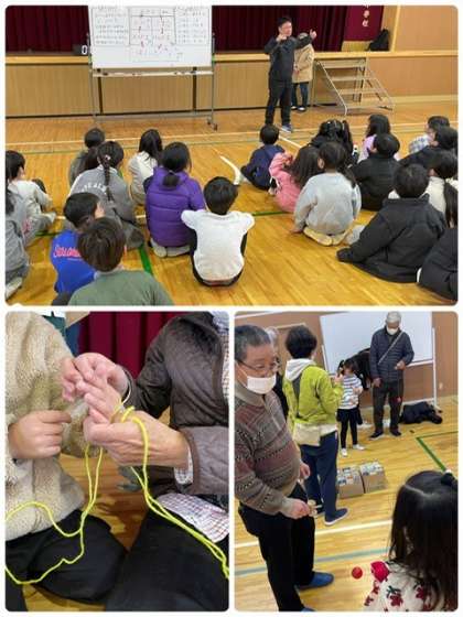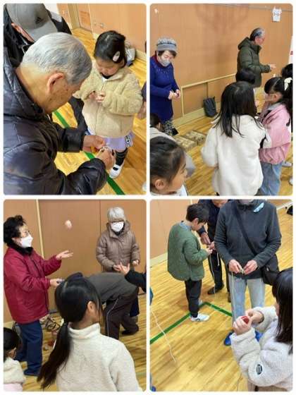 今日は「新北島老人クラブ」の方々に来校していただき、一緒に楽しみました。実際に遊び方を教えてもらうことで、「できた!」「そんな遊び方もあるの?」と新しい発見がたくさんありました。