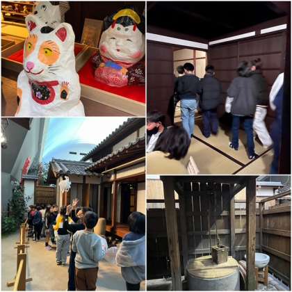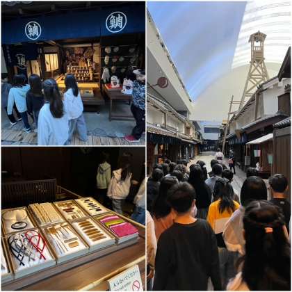 江戸時代の古い町並みが再現されています! 子どもたちは興味津々です♪ 上から見たり、実際に町を歩いたりしました。