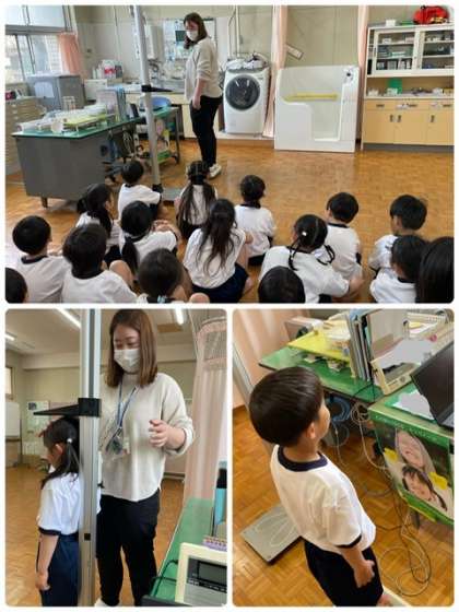今日は1年生がはじめて体操服に着替えました。洋服をきっちりとたたんで、着替えることができました。その後、保健室の先生に保健室の使い方や発育測定の方法を教えてもらいました。