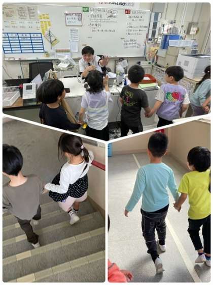 4階にあがって、音楽室や理科室などを探検しました。お兄さんやお姉さんが学習している様子を見ることもできました。「大きなテレビがあるよ」「黒板に字がいっぱい」といろいろなことを発見して、楽しそうな様子でした。