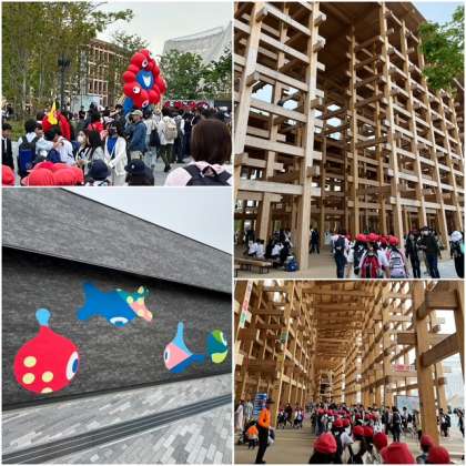 夢洲駅に到着しました! 誘導のスタッフがたくさんいてスムーズにゲートまでたどり着きました。少し待ちましたが無事入場。大屋根リングを歩いて、ガンダムの近くでお昼ご飯です♪