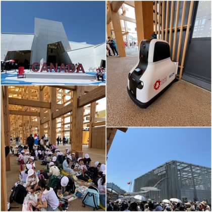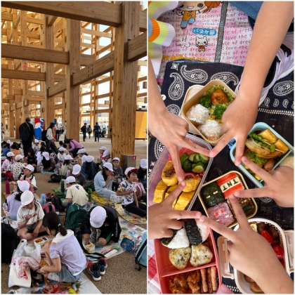 大屋根リングの下は涼しいです! お待ちかねのお弁当とおやつの時間♪ お弁当の横をスウェーデンの民族音楽を演奏するパレードが通りました。「まるで外国やん!」と子どもたち。カナダ館とポルトガル館のすぐ近くで食べました。