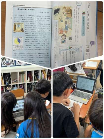 「いざというときのために」という国語の授業なかで防災について調べて提案書を考えていました。班活動のなかで、どの情報が必要か、どんなことを調べるのか考えていました。