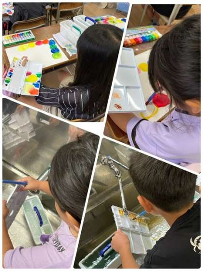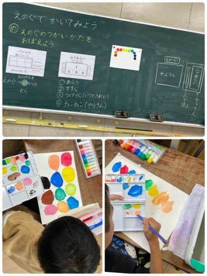 2年生の教室では、はじめての絵の具に挑戦していました。