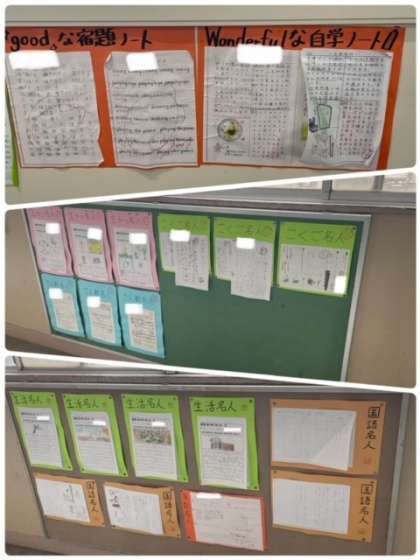 ノートが上手に書けていたり、自分流に工夫してまとめていたりするノートが掲示がされていました。先生の板書だけではなく、自分の考えやイラストなどを付けくわえてあって、とても見やすくまとまっていました。