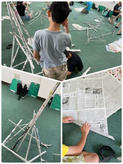 新北ルームでは4年生が新聞紙を使って棒状にして造形あそびをしていました。「タワーを作ろう!」「家を作ろう!」と言いながら、どうすれば安定するのか、友だちと話し合っていました。