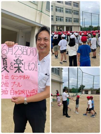朝は晴れていたので、運動場で朝会を行いました。校長先生から「夏至」のお話から「夏が好き?冬が好き?」の尋ねられると、意外に半数ずつくらいに分かれていました。