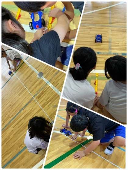 ゴムをいろいろな長さに伸ばすと車の進み方がどうちがうのか調べていました。班の友だちと協力して、どれだけ進んだのかメジャーを使って測っていました。