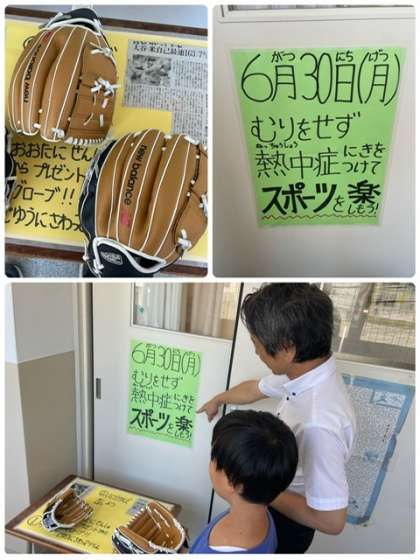 校長先生は金曜日にオリックスVS楽天の試合を観戦されたそうです。さらに、みんなが好きなスポーツを尋ねられて、結果は水泳や野球が人気でした。さらに、校長室に置いてあった「大谷選手からのグローブ」を紹介してくださいました。