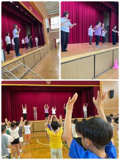 今日の朝会では、「新北島民謡クラブ」のみなさんに来ていただき、盆踊りの練習に取り組みました。万博のテーマソング「この地球の続きを」の曲にあわせて踊りました。