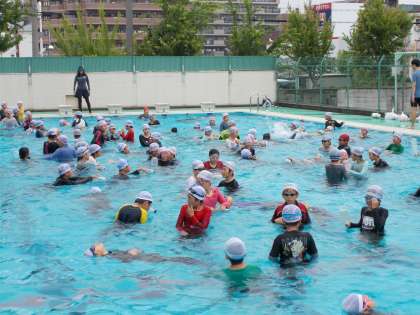 着衣水泳を行いました。服を着たままプールに入ったので、最初は大はしゃぎ!「その場で浮いてみましょう。」という指示があり、挑戦してみましたが、なかなかうまくいきません。その後、水難事故の話をすると、真剣な表情で話を聞いていました。水難事故にあったら「浮く」ことが大切だということを学び、服に空気を入れたり、ペットボトルを使ったりして、「浮く」感覚をつかみました。