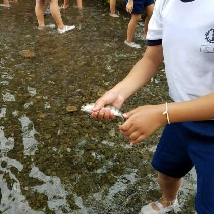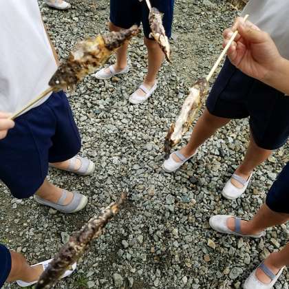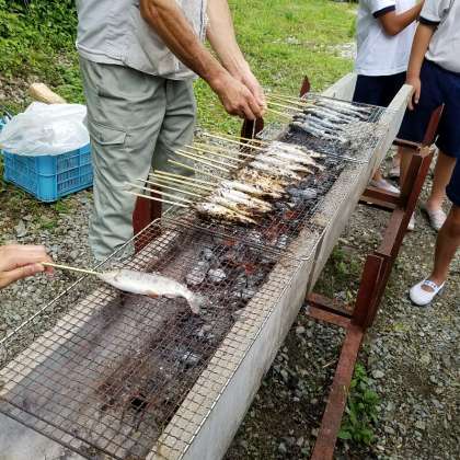 スタートの合図と共に、いきなり捕まえた子どももいました。大きな歓声をあげながら、冷たい水のなかを走り回って、一生懸命、アマゴを捕まえています。捕まえたアマゴは、櫛に刺してもらって、塩焼きにしてもらっています。