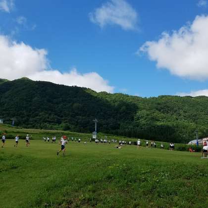 スムーズな進行で、時間に余裕ができたので、宿舎の前の芝生で遊んでいます。霧も晴れて、少しずつ青空も見えてきました。芝生の上を走り回って、子どもたち、本当に楽しそうです。