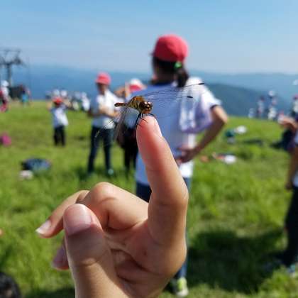 山頂には、トンボがたくさん飛んでいて、人差し指を伸ばすとその先に止まります。