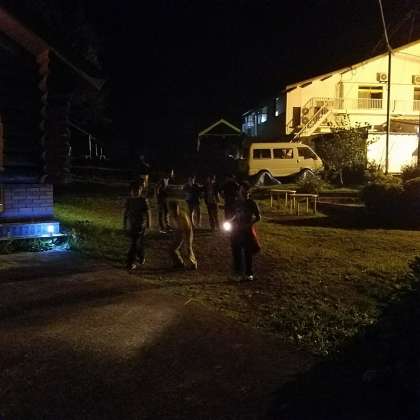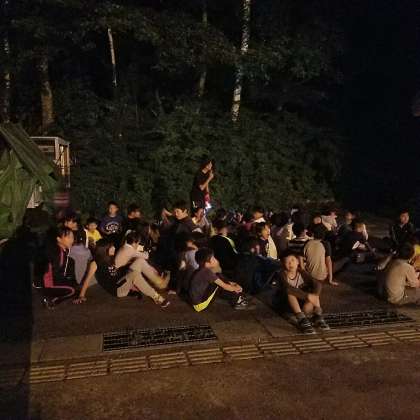 班で1つの懐中電灯を頼りに、班員全員が協力して歩く