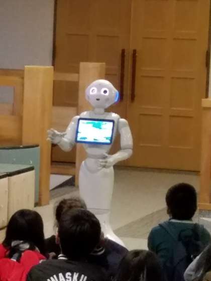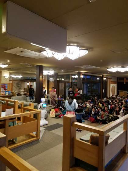 ホテル「みち潮」に到着して、開舎式を行いました。ホテルの方からのご挨拶の後、新入社員のペッパーカシコさんからホテルの説明を受けました。その後、一旦部屋に入ってから、避難訓練を行いました。