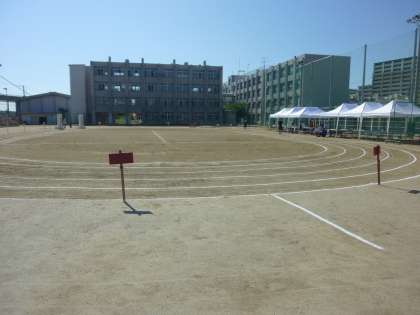 土曜日の今日、梅雨とは考えられないような天気の中、小学校の職員で運動会の準備をしました。広く何もない中学校のグランドが時間の経過とともにすっかり小学校の運動会の雰囲気が出来上がりました。