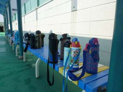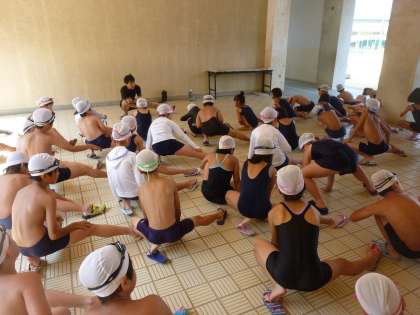 暑さや子どもたちの体調の事も考えて、受付・準備体操を風通しの良いピロティで行ったり、プールサイドに水筒を置いて途中で水分補給をするようにしたりして活動しています。