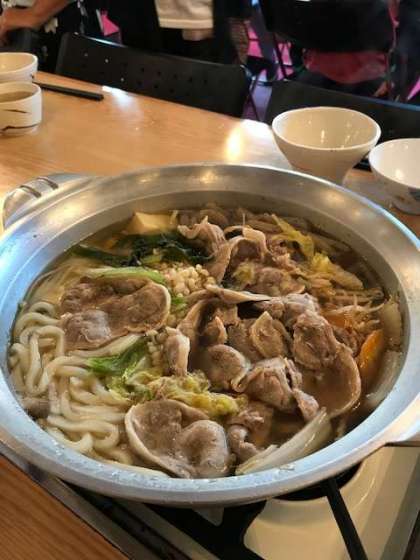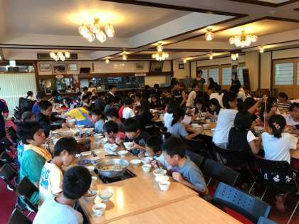 今日の夕食はかも鍋♪みんなペロリと平らげていました!また、同じテーブルの人たちが協力し、とても手早く後片付けをしていました!