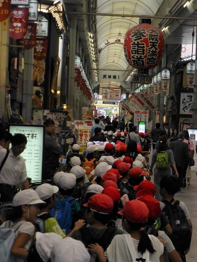 扇町公園での活動が終わると、日本一長いアーケード商店街である天神橋筋商店街へ行きました。新北島小学校周辺には、アーケード商店街はないので、屋根があることにびっくり!金物屋さんや呉服屋さん、刃物屋さんなど専門店がたくさんありました。また、社会見学でスーパーマーケットへ行くので、商店街と比較しながら学習できたらなと思います。