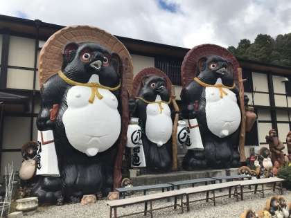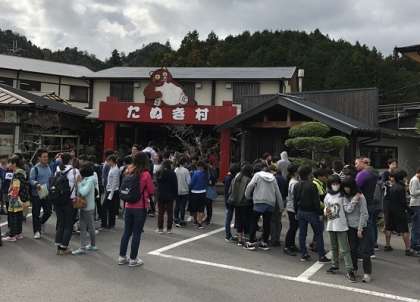 大きな信楽焼きのたぬきに迎えられて、予定通りたぬき村に到着しました。陶芸体験の前に腹ごしらえ。温かいうどんと釜飯を堪能しました。