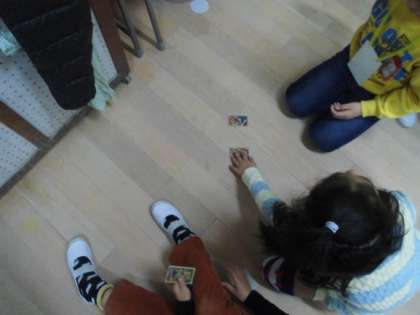 新北島地区老人会の方々に来ていただき、あやとり、お手玉、けんだま、めんこ、おはじき、だるまおとし、竹とんぼ、こままわしの遊び方を教えていただきました。